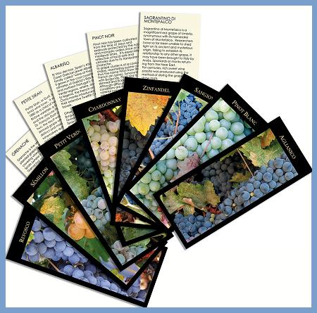photo of the grape variety on one side. The other side features interesting history, lore, origin, a description of the varietal,